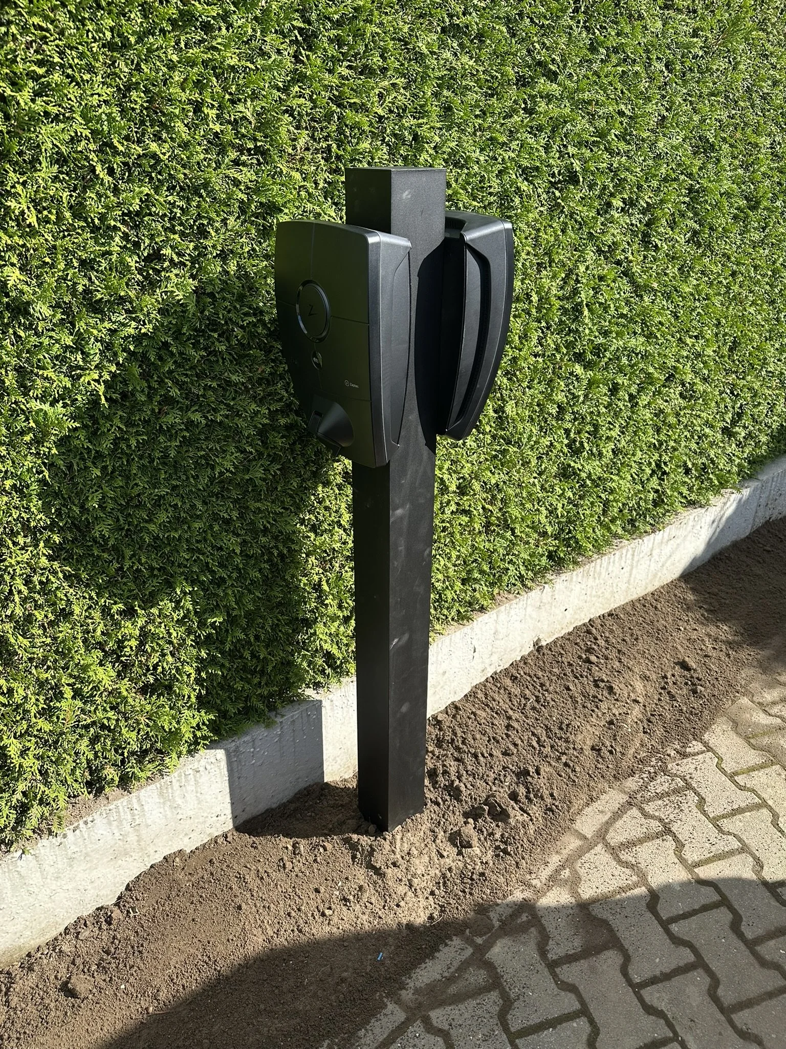 Installatie van 4 Zaptec EV laders waarvan 2 stuks gemonteerd op een zuil en 2 stuks aan de wand.
